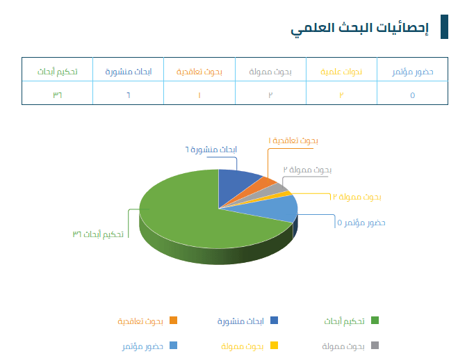 جانب من احصائيات البحث العلمي في كلية علوم الرياضة والمتمثلة في نشر الابحاث، الندوات العلمية، وتحكيم الابحاث العلمية.