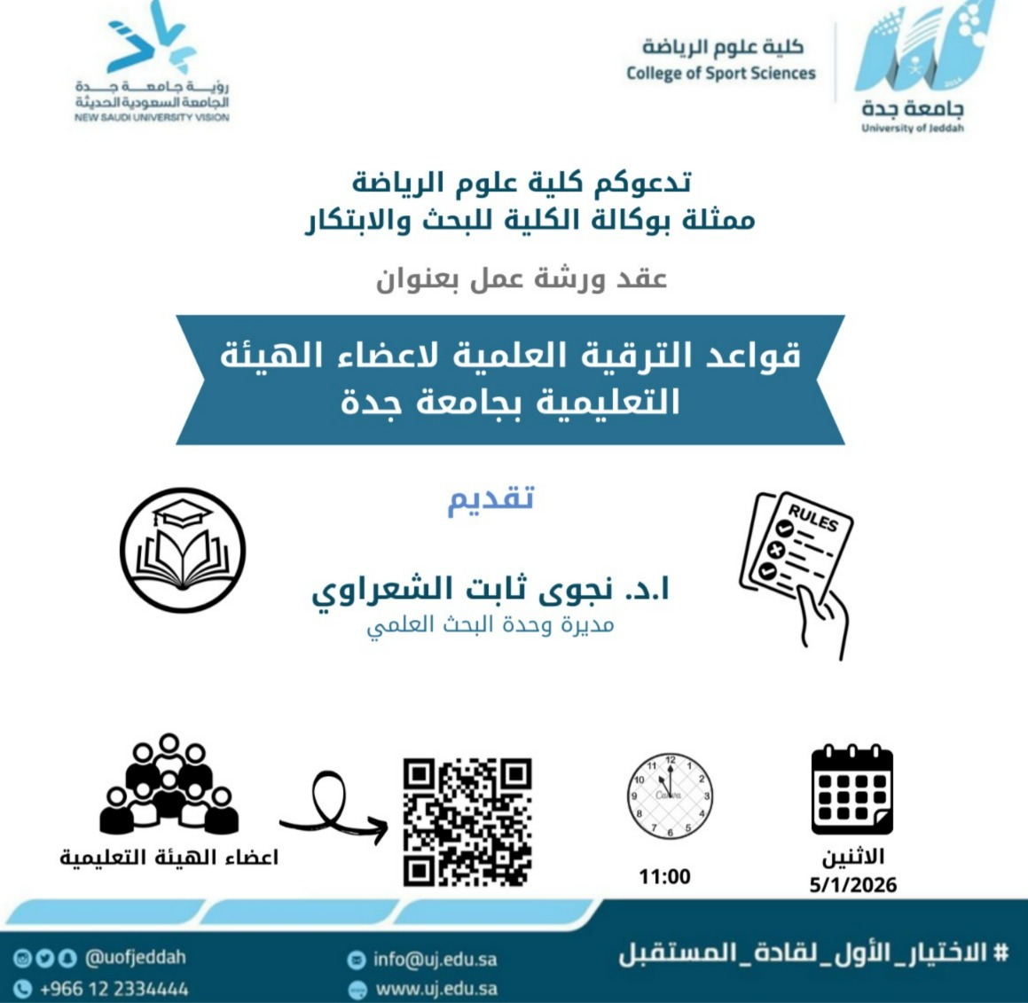 نلتزم في كلية علوم الرياضة بجامعة جدة بتوفير بيئة تعليمية ومنظومة بحث وابتكار لإعداد جيل من المتخصصين والقادة ورواد أعمال بمهارات مبتكرة للمستقبل الرياضي، يساهمون في مؤشرات الناتج المحلي ويشاركون في تعزيز جودة حياة المجتمع.